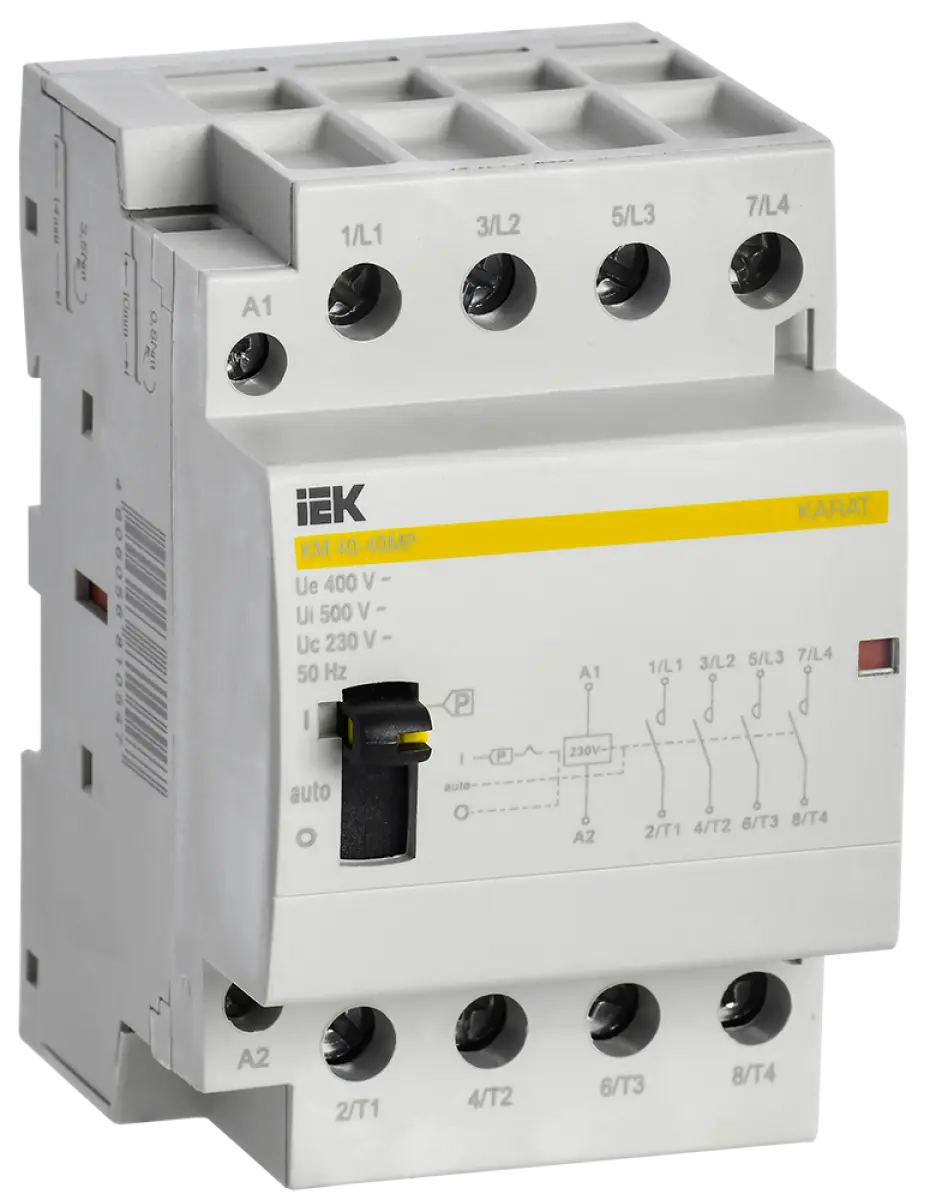 Контакторы модульные типа КМ торговой марки IEK предназначены для применения в сетях переменного тока напряжением до 400 В частоты 50 Гц и служат для коммутации слабоиндуктивных нагрузок с номинальным током до 63 А.